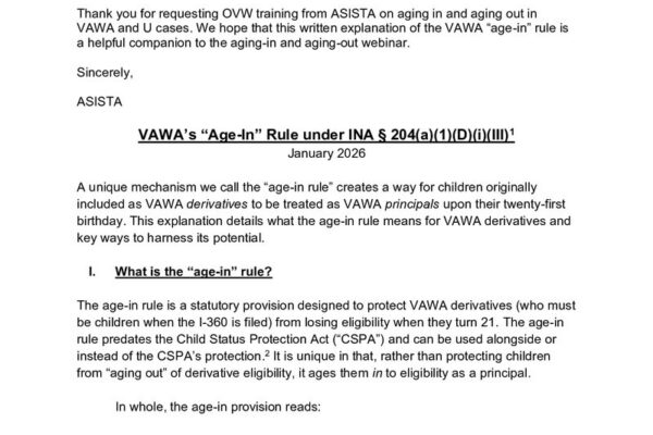 The age-in rule is a statutory provision designed to protect VAWA derivatives from losing eligibility when they turn 21. This written resource describes the age-in rule and provides practical tips for practitioners to harness its potential.