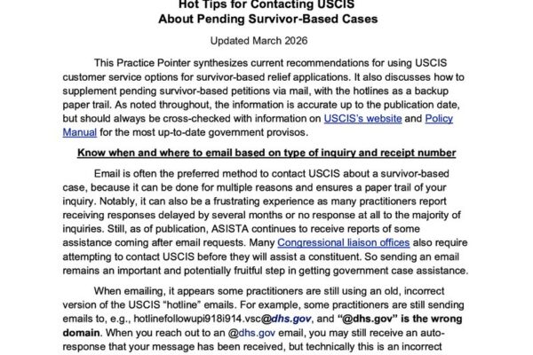 This Practice Pointer synthesizes current recommendations for using USCIS customer service options for survivor-based relief applications. It also discusses how to supplement pending survivor-based petitions via mail, with the hotlines as a backup paper trail. As noted throughout, the information is accurate up to the publication date, but should always be cross-checked with information on USCIS’s website and Policy Manual for the most up-to-date government provisos.