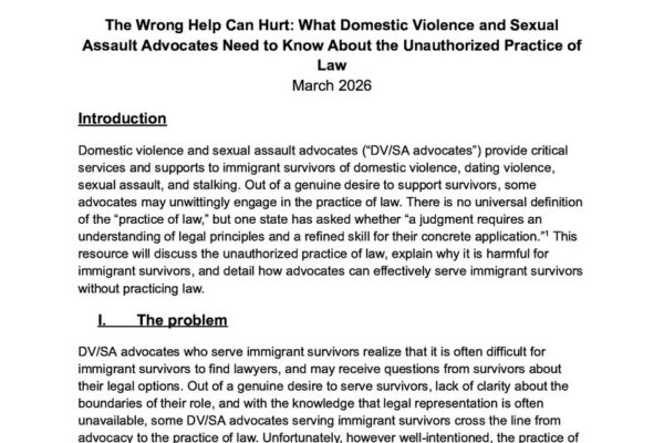 Domestic violence and sexual assault advocates (“DV/SA advocates”) provide critical services and supports to immigrant survivors of domestic violence, dating violence, sexual assault, and stalking. Out of a genuine desire to support survivors, some advocates may unwittingly engage in the practice of law. This resource will discuss the unauthorized practice of law, explain why it is harmful for immigrant survivors, and detail how advocates can effectively serve immigrant survivors without practicing law.