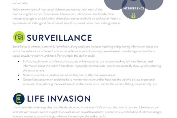A handout detailing examples of how sexual violence can intersect with each of the four stalking SLII tactics (Surveillance, Life invasion, Intimidation, and Interference through sabotage or attack), which themselves overlap and build on each other.