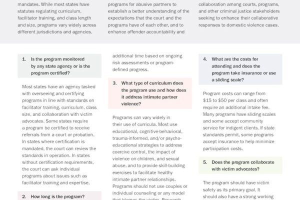 This two-page handout is designed for courts that include programming for abusive partners in their case dispositions. It lists the 10 most important questions court staff should ask as they consider making referrals and provides general information on national best practices.