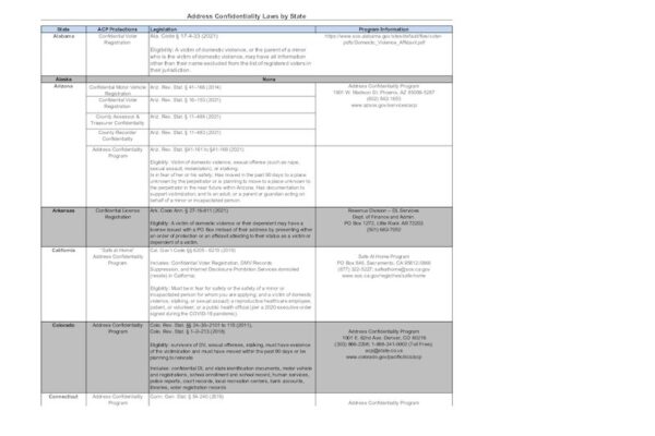 List of Address Confidentiality Programs by state. These programs provide an alternate address to protect survivor privacy.
