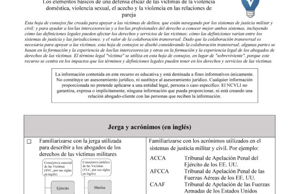 Esta capacitación, impartida por nuestros socios del Instituto Nacional de Derecho para Víctimas de Delitos (NCVLI), le proporcionará las herramientas y los conocimientos necesarios para marcar una diferencia tangible en la vida de los supervivientes vinculados al ámbito militar que se enfrentan al sistema legal.
