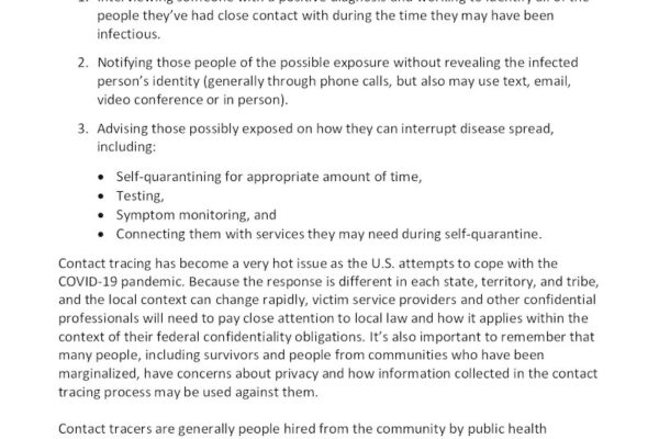 This resource was created to help local programs understand the contact tracing process, how to navigate contact tracing in a way that centers public health while maintaining VAWA confidentiality obligations, and offer tips for navigating common scenarios that arise for local programs related to contact tracing.