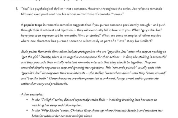 A guide outlining potential discussion questions and activities on the first season of the Netflix television show “You”.
