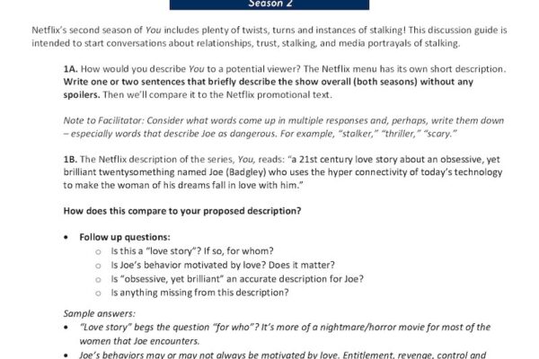 A guide outlining potential discussion questions and activities on the second season of the Netflix television show “You”.