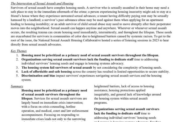 Survivors of sexual assault experience unique housing challenges. This resources explores key findings from a series of listening sessions hosted by the National Sexual Assault Housing Collaborative.