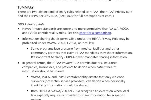 Victim service providers need technology that provides appropriate privacy protections to help them comply with VAWA, VOCA, and FVPSA confidentiality obligations. Use of the term “HIPAA-Compliant” by technology vendors sometimes causes confusion. The purpose of this handout is to clarify what HIPAA is, what it is not, and what a vendor saying “HIPAA-compliant” might mean.