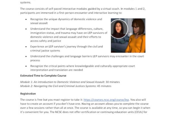 This introductory course seeks to equip court and legal interpreters with fundamental knowledge and insights about domestic violence and sexual assault that will enhance their ability to help LEP survivors make their voices heard. Interpreting for Domestic Violence and Sexual Assault Cases consists of two self-paced interactive modules (generally 20-45 minutes in length) guided by a virtual coach.