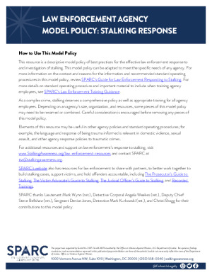 This resource is a descriptive model policy of best practices for the effective law enforcement response to and investigation of stalking. As a complex crime, stalking deserves a comprehensive policy as well as appropriate training for all agency employees. Depending on an agency’s size, organization, and resources, some pieces of this model policy may need to be renamed or combined. Careful consideration is encouraged before removing any pieces of this model policy.