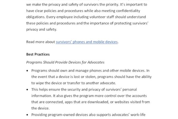 This resource for victim service providers covers privacy and safety concerns when using phones or other mobile devices for work with survivors.