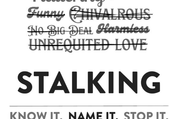 A black and white version of a poster featuring crossed-out words and phrases that are commonly used to discount the experiences and feelings of stalking victims. Also shows the slogan “Stalking: Know it, name it, stop it.”