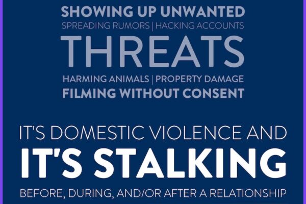 A poster detailing actions that fall under the categories of domestic violence and stalking