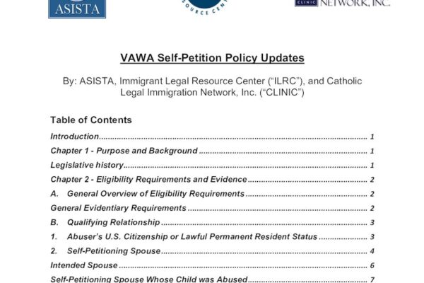 ASISTA, the Immigrant Legal Resource Center (“ILRC”), and Catholic Legal Immigration Network, Inc. (“CLINIC”) co-authored the VAWA Practice Advisory: VAWA Self-Petition Policy Updates, June 2022.