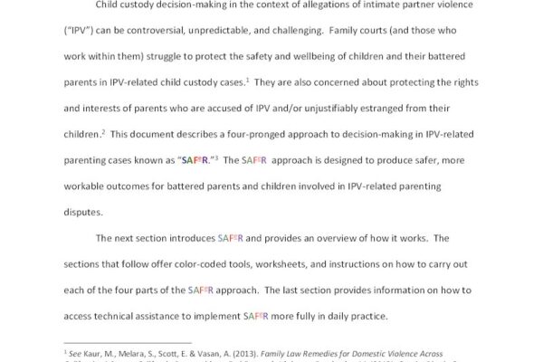 This is one of the tools used in the SAFeR approach. SAFeR is an approach to decision making in IPV-related family law matters. It consists of four parts: (1) screening for IPV; (2) assessing the full nature and context of IPV; (3) focusing on the effects of IPV; and (4) responding to IPV in all recommendations, decisions, and interventions. For more information, please see http://www.bwjp.org/our-work/projects/safer.html