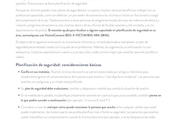 A guide (in Spanish) on general safety planning tips and information for those experiencing stalking. This guide is not designed to replace a personalized safety plan created with the assistance of a professional.