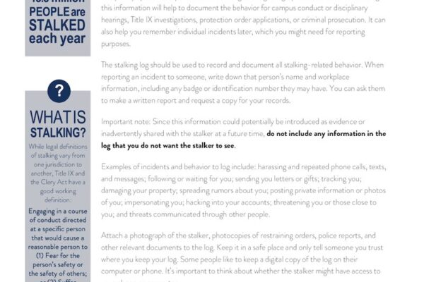 The stalking log should be used to record and document all stalking-related behavior. Recording this information will help to document the behavior for campus conduct or disciplinary hearings, Title IX investigations, protection order applications, or criminal prosecution. It can also help you remember individual incidents later, which you might need for reporting purposes.