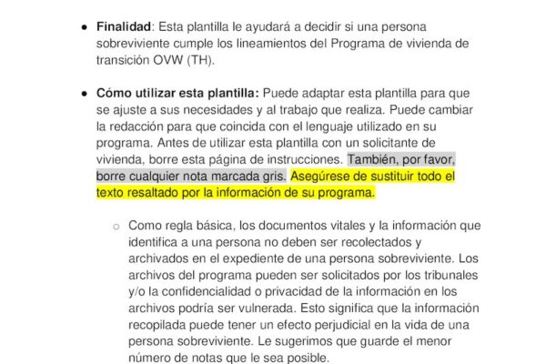 SPANISH – This packet contains the template documents that have been crafted by the NNEDV transitional housing (TH) team. While there are no mandatory documents in the OVW TH program, there are some required pieces to make sure that services are clearly advertised to survivors; that survivors’ privacy and confidentiality rights are being protected; and that there are clear application and eligibility processes for survivors and advocates to understand. With that said, our toolkit includes other documents that programs usually use. While they are not mandatory to use, we believe that these versions of the documents align with OVW’s philosophy and are available to use at any time. Included: – Plantilla de buenas pr?cticas: Solicitud de vivienda – Herramienta para establecer metas – Procedimiento para quejas en la vivienda transicional – Gu?a de admisi?n de la vivienda de transici?n – ?Bienvenida al programa de vivienda transicional! – Excepci?n para la duraci?n de alojamiento – Glosario de los documentos del conjunto de herramientas la vivienda de transici?n (TH) – Gu?a para la creaci?n o revisi?n de pol?ticas y formularios – Apelaci?n de una negaci?n de solicitud de servicios del programa de vivienda transicional – Plantilla: formulario sobre la divulgaci?n de informaci?n limitado para usar con un cliente – Plantilla de pol?tica/procedimientos para la retenci?n de documentos de clientes – Plantilla: carta al propietario – Plantilla: carta de verificaci?n del participante