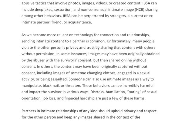It has become increasingly common to send intimate content to a partner as technology is replacing human interaction. Is sexting the problem? No, the misuse and sharing of these images without consent is the problem, not the images themselves. Unfortunately, abusers can use intimate images as a way to manipulate, blackmail, or threaten survivors. This informational handout provides information about Intimate Images and highlights what Non-consensual Intimate Images is and what it is not.