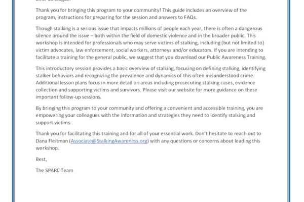 A guided script for the facilitator of a public awareness workshop on the basics of stalking